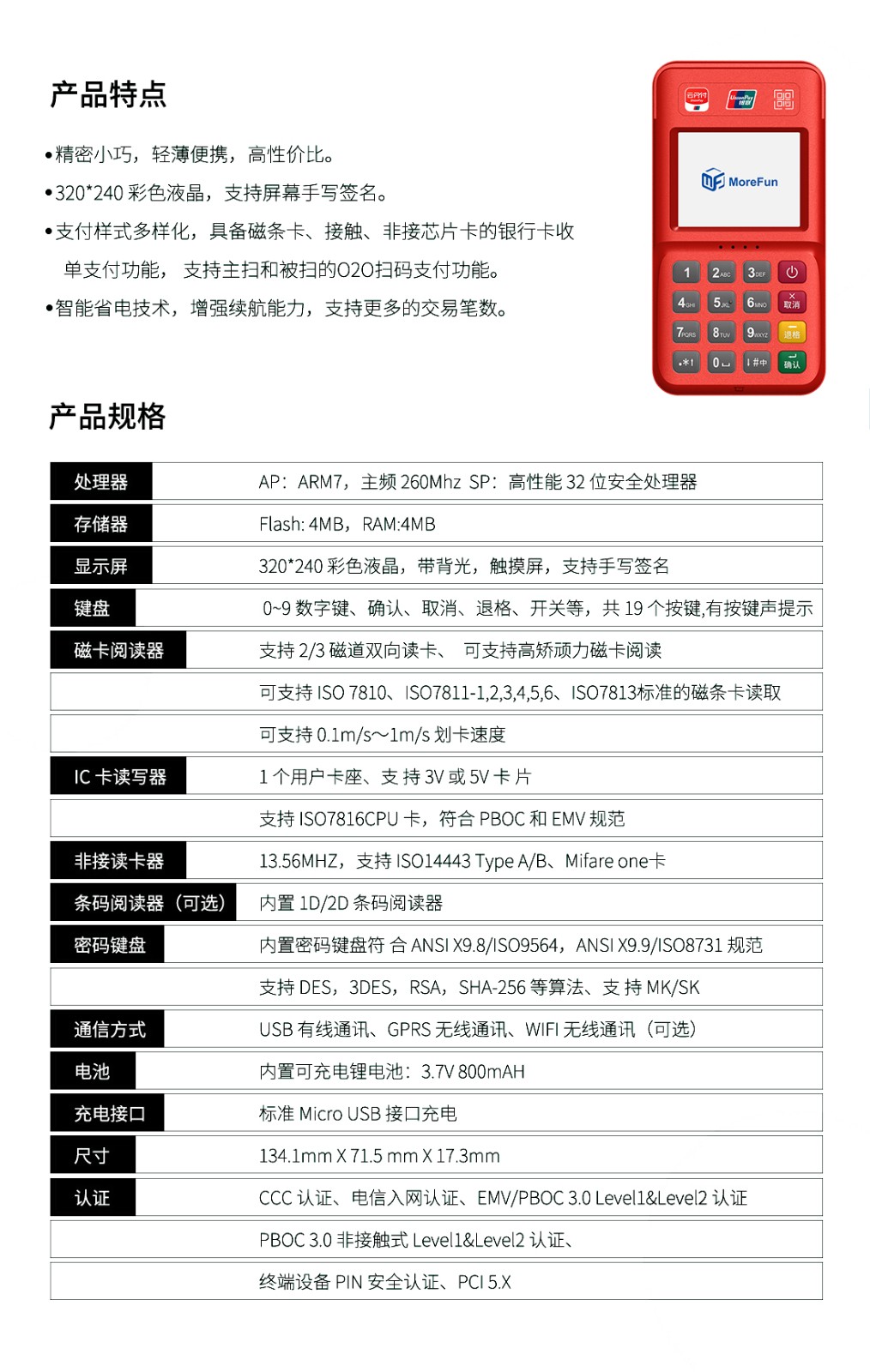 首页>>辛集产品中心>>辛集手持无线POS 辛集联动优势-优POS Pro 高配版 * 性能优越:32位高性能ARM11安全CPU;整机通过业内更先进的PCI PED4.X 安全认证及国内受理终端PIN输入设备安全评估检测认证,多项措施保障金融交易的安全;* 时尚外观:外形小巧携带方便,高抗跌落性能、宽工作温度、防水防尘设计、外壳坚固耐刮、户外携带式作业更加耐久可靠。* 通讯备份:支持2G-3G扩展;* 超长续航:3.7V-800毫安稳定续航能力,智能电池管理保证持续工作18小时,待机72小时。 标准配置 返 回